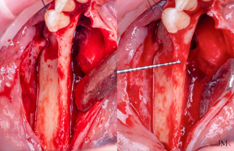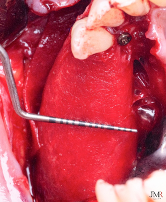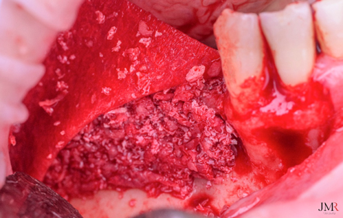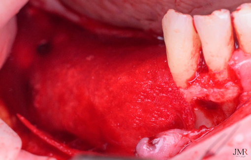 Visión lateral durante la ejecución de la regeneración, usando la membrana Matriz Flex y la mezcla del injerto autógeno y xenógeno porcino (MatrixOss).