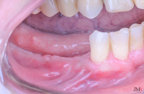 Visión lateral del defecto óseo, donde se observa la salida del nervio mentoniano y su relación con la zona que vamos a regenerar.