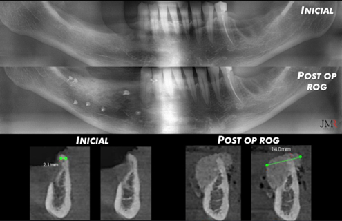 Comparación situación radiográfica inicial y tras realizar la regeneración ósea guiada (ROG).