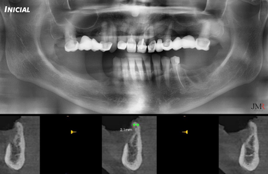 Pruebas radiográficas iniciales: Radiografía panorámica y CBCT (plano sagital), donde observamos el grado de atrofia ósea horizontal (moderada – severa) del defecto y su relación con el agujero mentoniano.