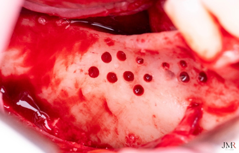 Realizamos unas perforaciones corticales sobre el defecto, para promover la vascularización y la osteogénesis en el injerto óseo.