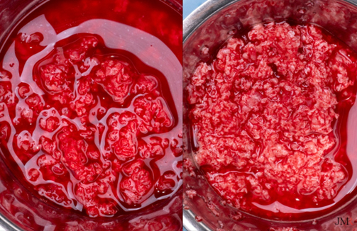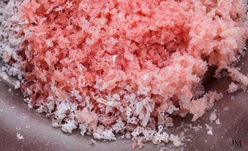 La batea de la izquierda tiene hueso autógeno recolectado con rascador óseo desechable, y la derecha, se observa como el hueso autógeno está mezclado con el xenoinjerto porcino (MatrixOss)