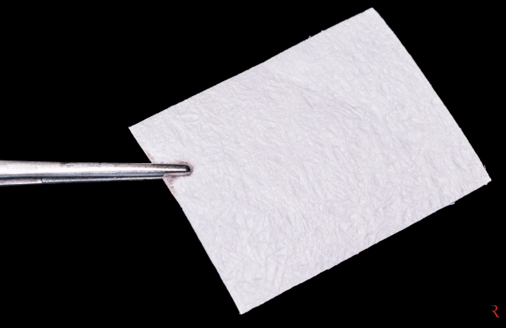 MatrixOss, xenoinjerto porcino, en la batea metálica quirúrgica.